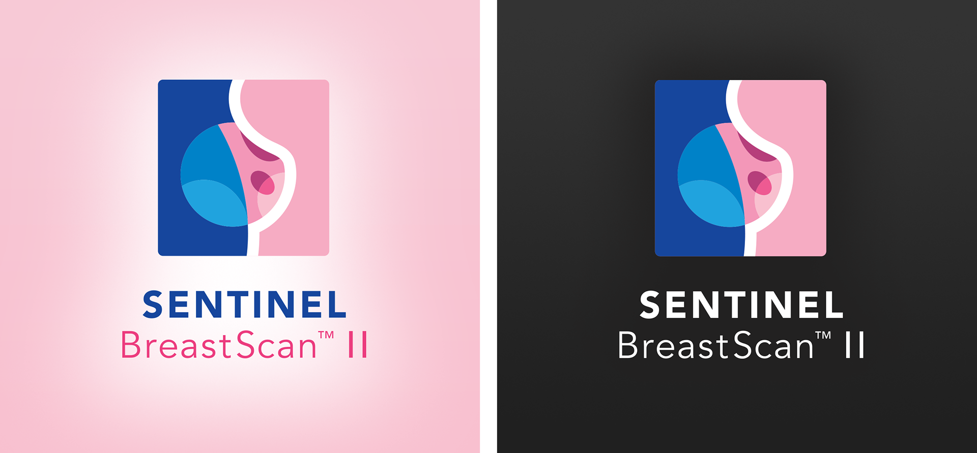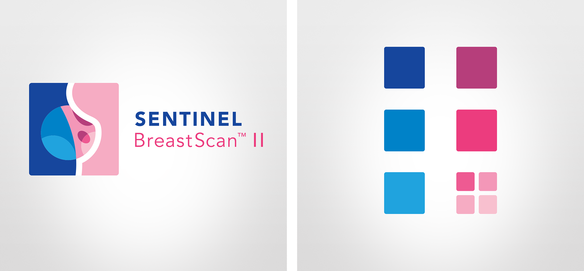 The brand mark is modern in style — constructed of overlapping ellipses to communicate the female form and mimic thermal imaging results. Color is limited to hues of pink (representing abnormal tissue and breast cancer awareness) and blues (healthy tissue).