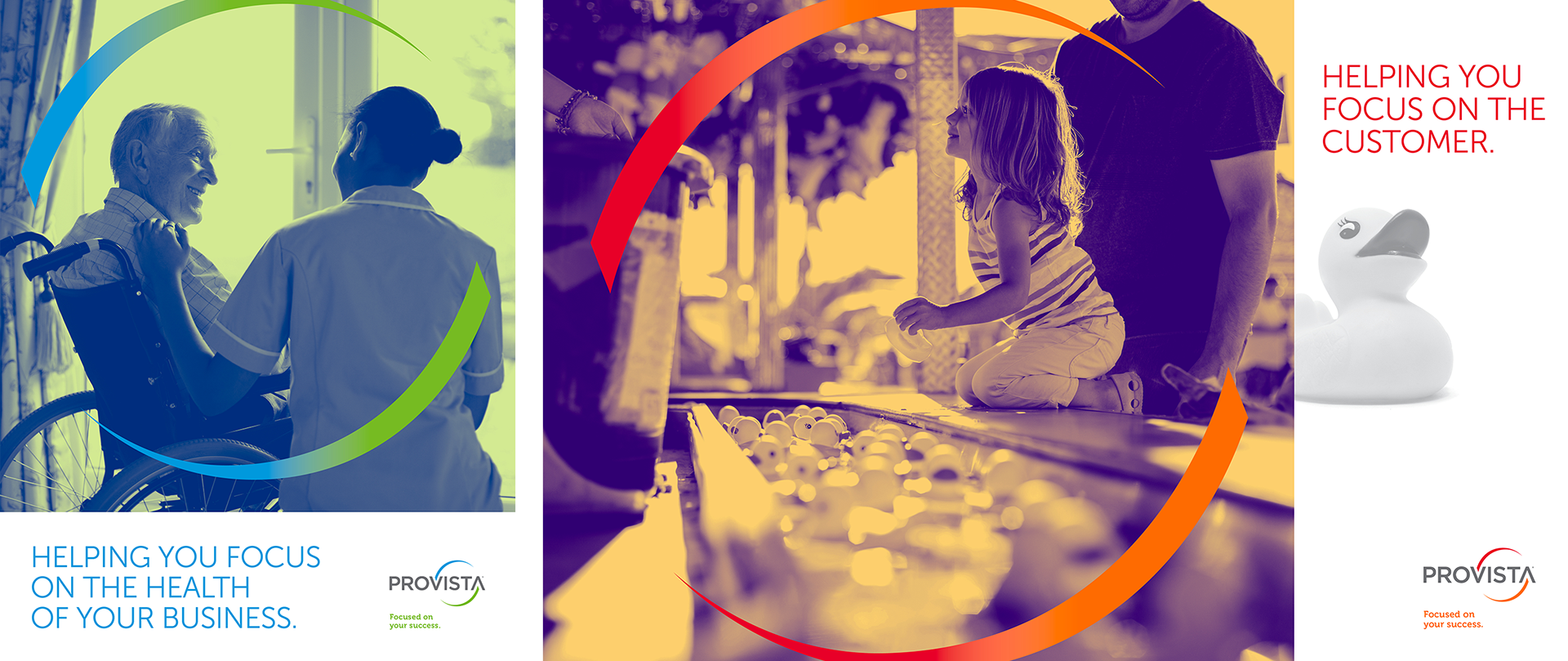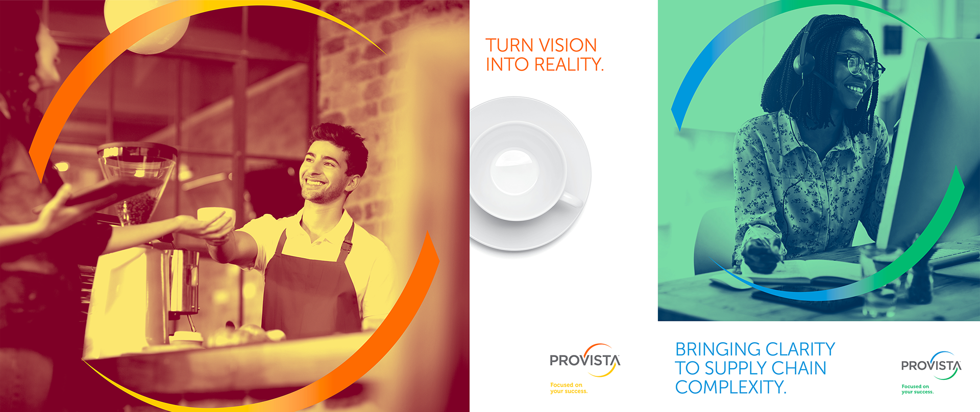 The wide array of Provista capabilities are represented by vibrant duotone photography and gradients. Imagery portrays their members in action as they interact with their products and consumers. Logotype curvatures act as a camera aperture that set the visual focus on what really matters — their member’s day-to-day business and success.