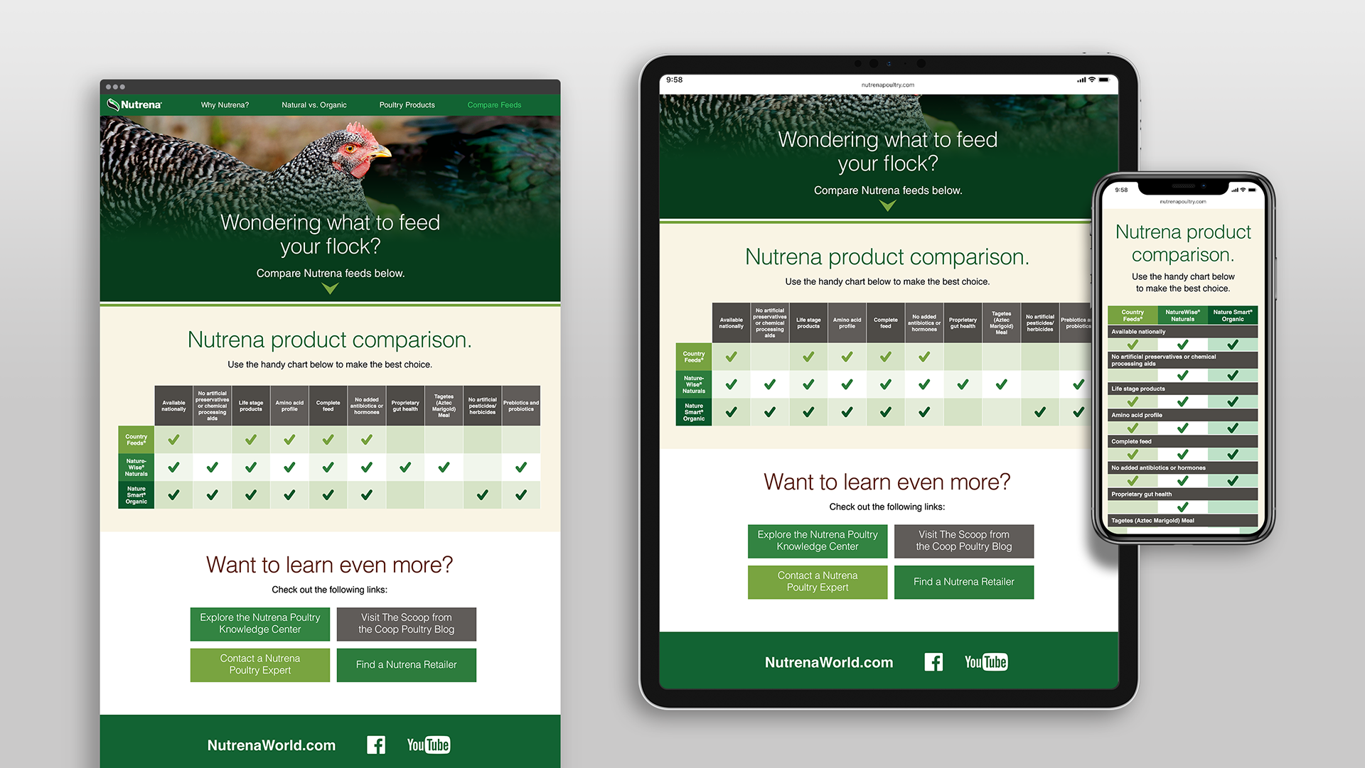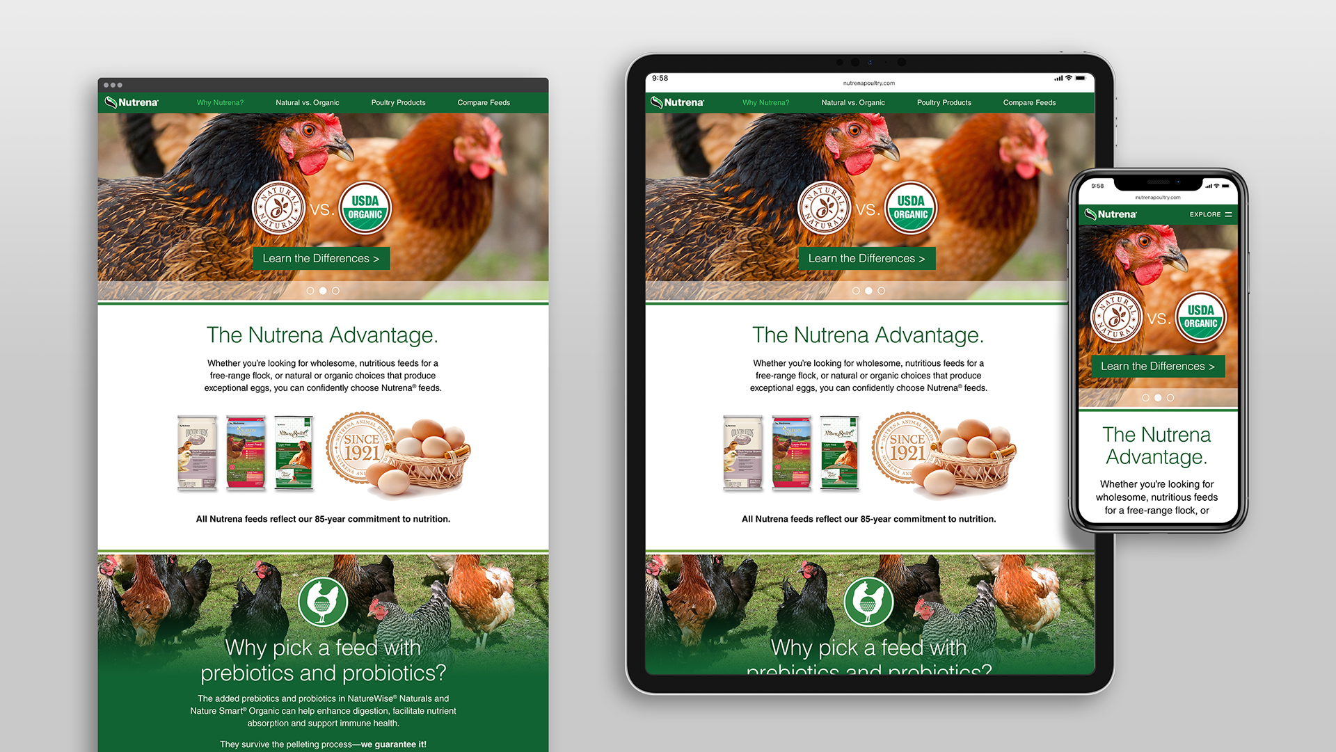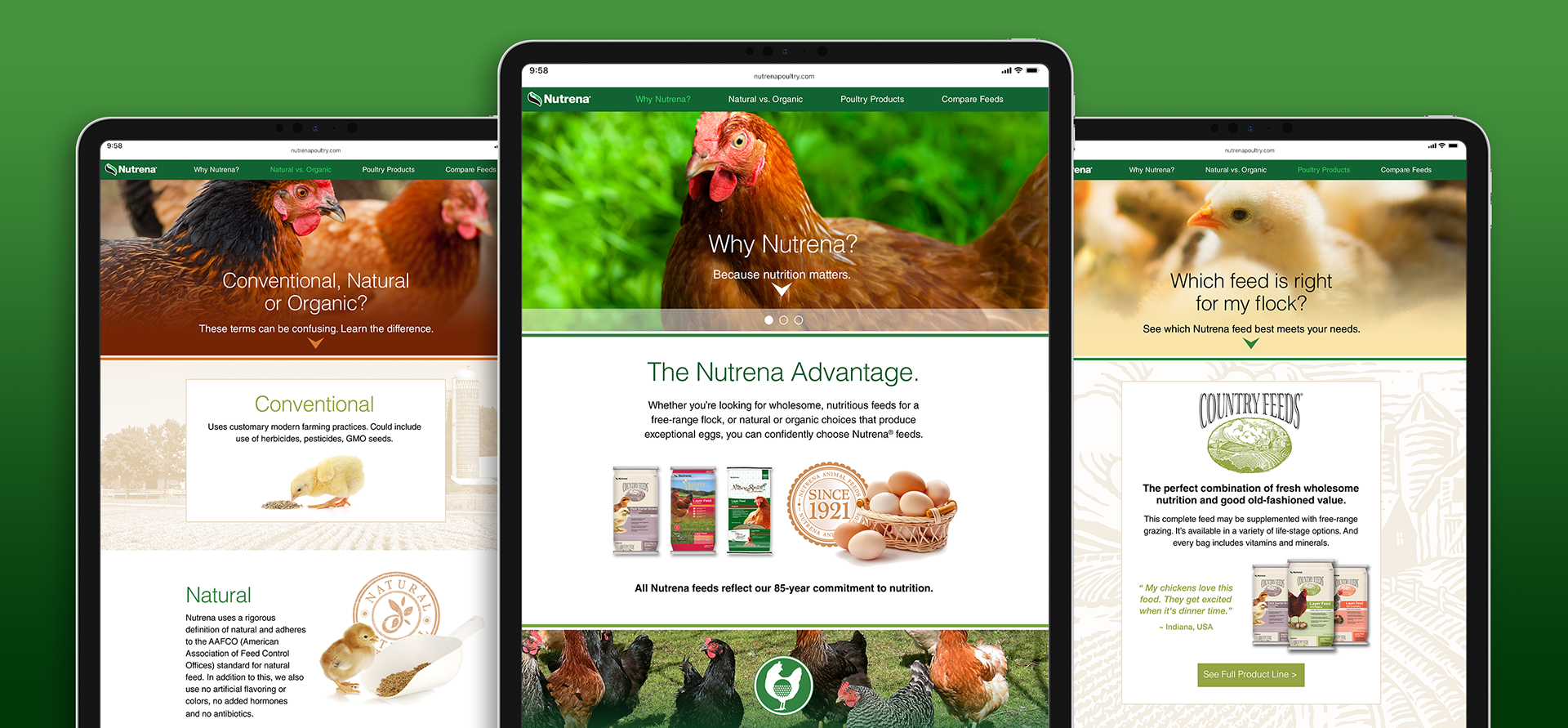 Cargill Animal Nutrition sought to create an online educational resource for its Nutrena poultry feed consumers. These consumers fell into three categories: value-focused, organic/natural-focused and suburban/urban poultry enthusiasts. Featuring a contemporary and responsive design experience — the site effectively communicated the differences between and the benefits of standard, natural and organic feeds.