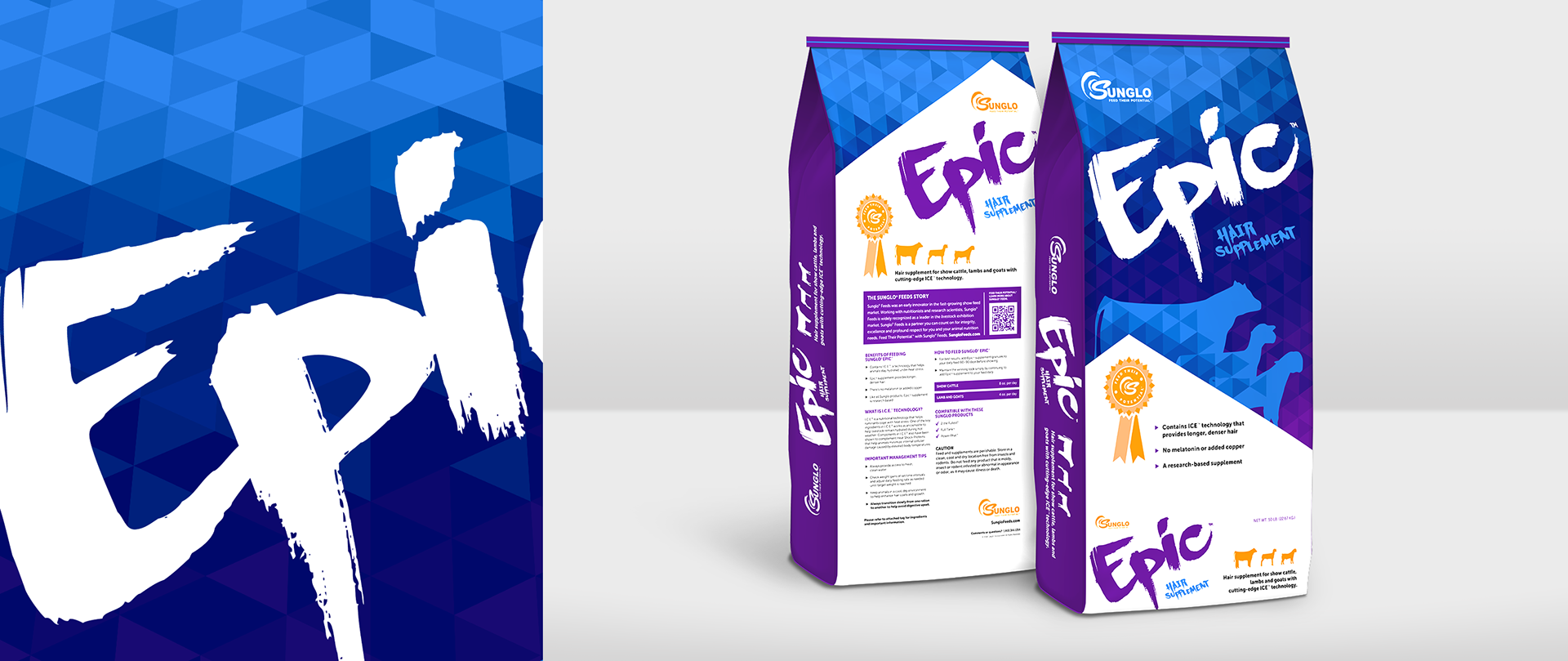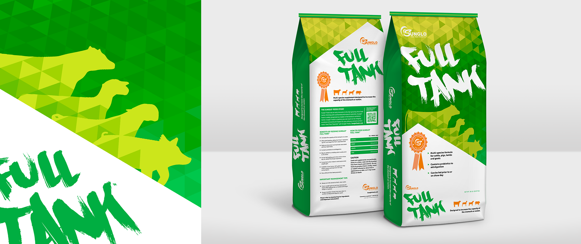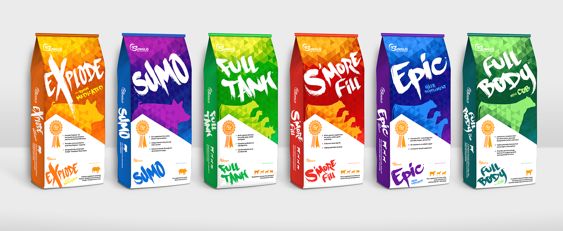 Cargill Animal Nutrition (CAN) wanted to refresh their premium show feed and supplement brand, Sunglo. The goal was to have the brand make more of a splash in the market — appealing to a younger audience with a cooler aesthetic. The winning design features a bold color palette, simple animal silhouettes, and facet-style backgrounds which make Sunglo really standout.
